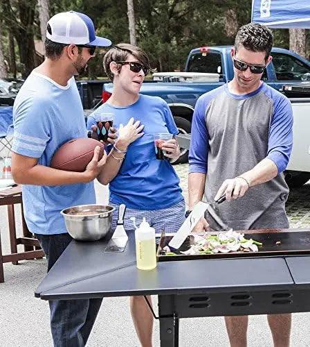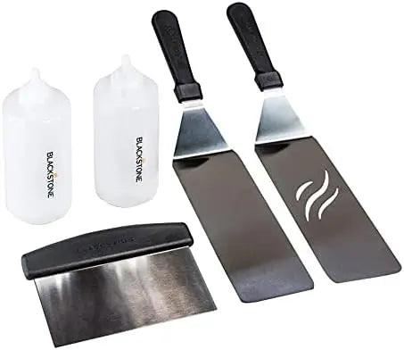 Cinco ferramentas – 2 grades de aço estilo aquecedor de nível profissional de tamanho grande, ótimas para virar hambúrgueres, panquecas, legumes e todas as outras aplicações de grelha. 1 cortador/raspador de aço inoxidável para cortar alimentos e raspar grelhas limpas. 2 frascos de ponta fina sem vazamentos para condimentos e líquidos como óleo água.